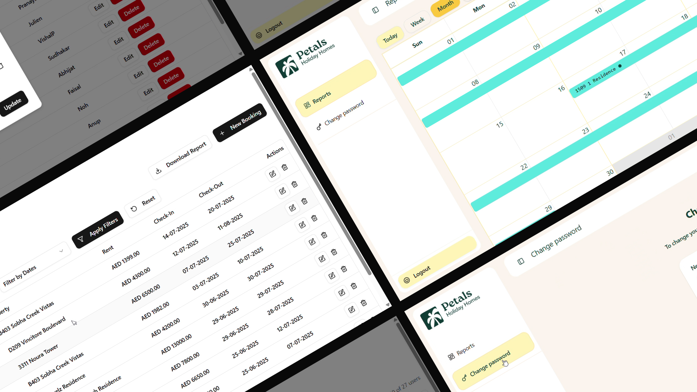 Managing multiple properties, bookings, and owner records had become increasingly complex for Petals. They needed a centralized platform that could handle booking histories, upcoming reservations, and performance tracking while offering property owners an easy way to view their income and occupancy data. The challenge was to design a two-sided CRM system that worked seamlessly for administrators and property owners, with real-time updates, accuracy, and an intuitive interface.Managing multiple properties, bookings, and owner records had become increasingly complex for Petals. They needed a centralized platform that could handle booking histories, upcoming reservations, and performance tracking while offering property owners an easy way to view their income and occupancy data. The challenge was to design a two-sided CRM system that worked seamlessly for administrators and property owners, with real-time updates, accuracy, and an intuitive interface.